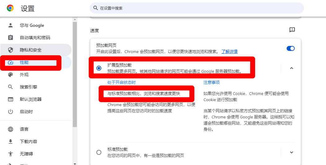 此外,还可以扩展型预加载选项,Chrome 会预加载您可能会访问的更多网页,以便提高这些网页在您访问时的加载速度,它与标准预加载相比,浏览和搜索速度更快。