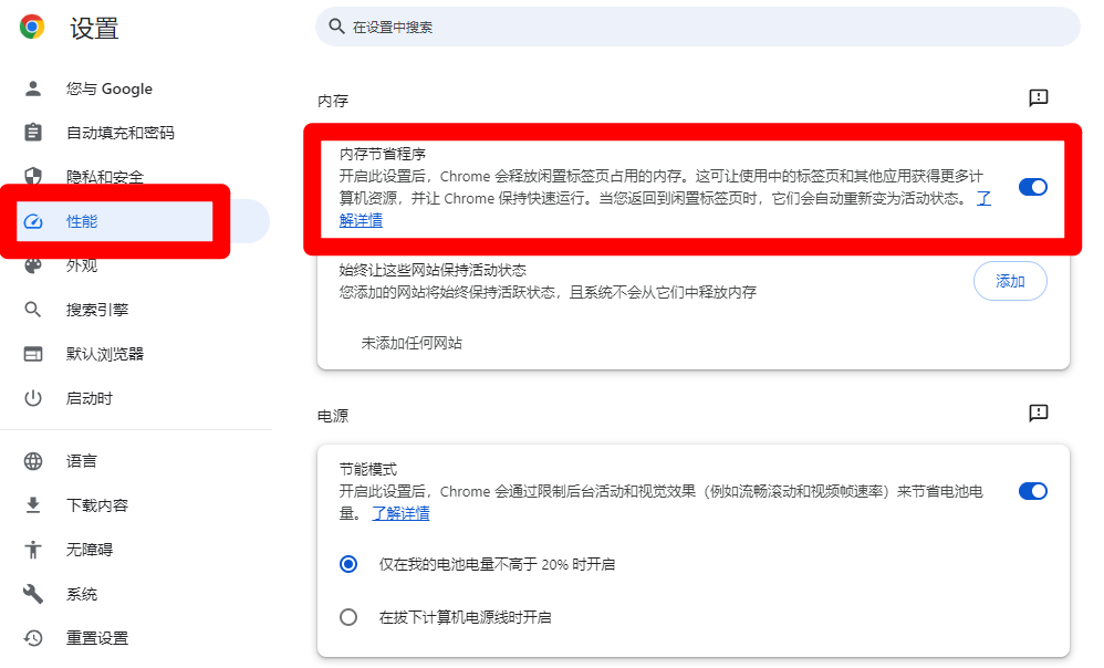 通过设置,开启内存节省程序,Chrome 会释放闲置标签页占用的内存。这可让使用中的标签页和其他应用获得更多计算机资源,并让 Chrome 保持快速运行。当您返回到闲置标签页时,它们会自动重新变为活动状态。