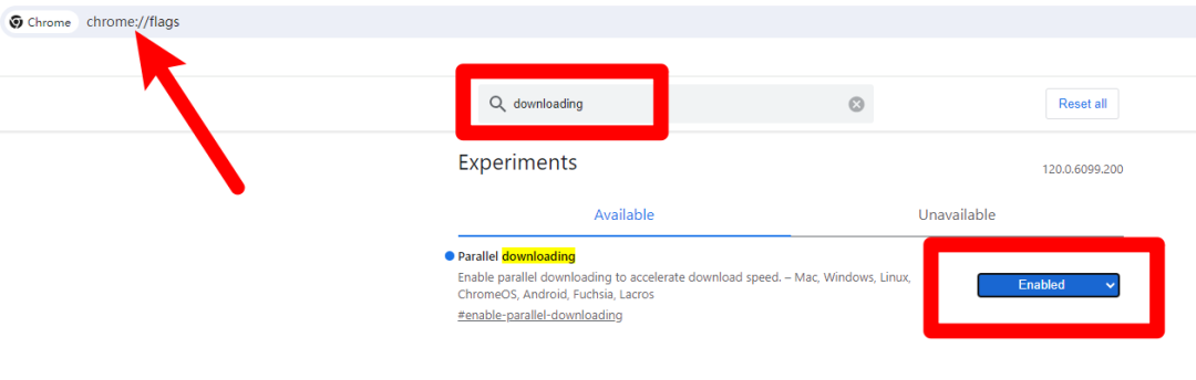 在输入框中输入“chrome://flags”,然后输入“downloading”快速找到“Parallel downloading”,最后将默认的Default更改为Enabled。