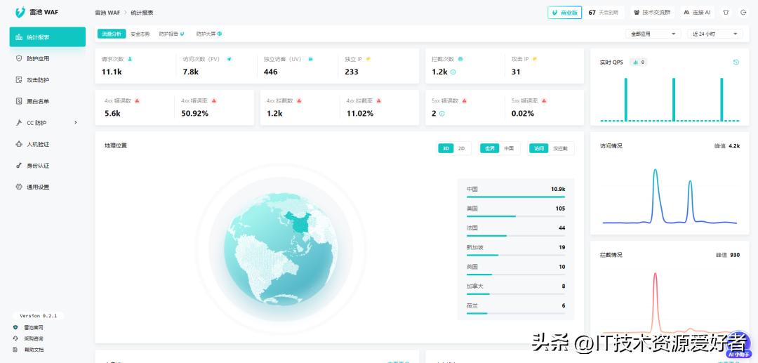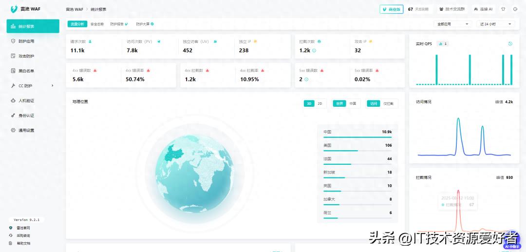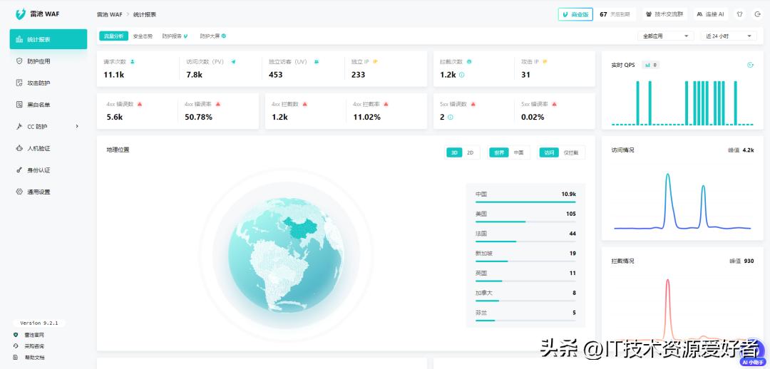 流量分析统计报表如下所示,统计数据包括请求次数、访问次数(PV)、独立访客(UV)、独立 IP、拦截次数、实时 QPS等等: