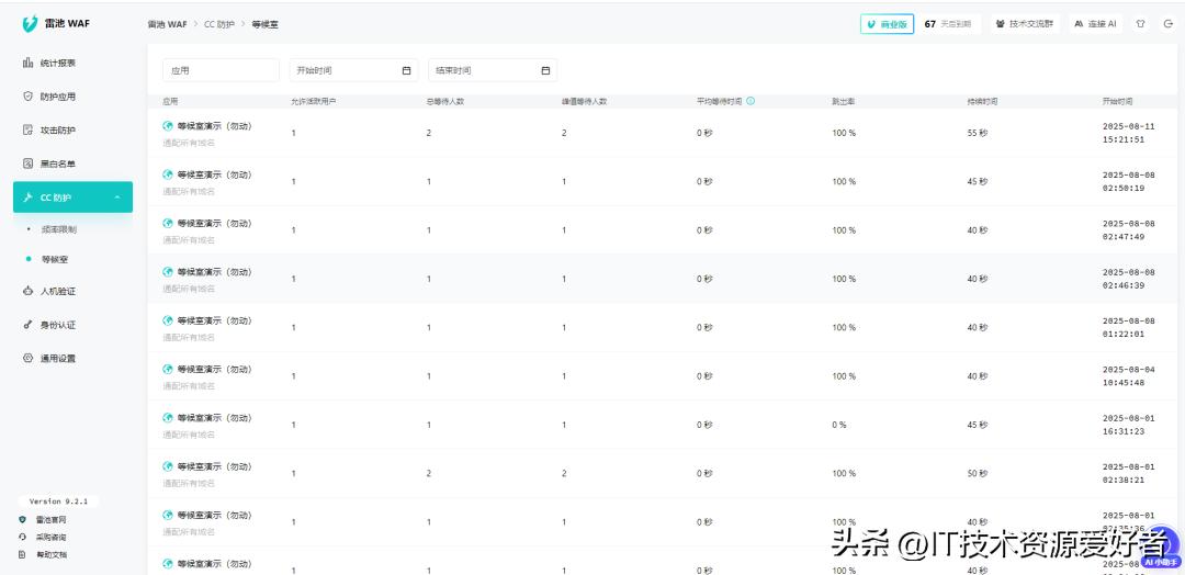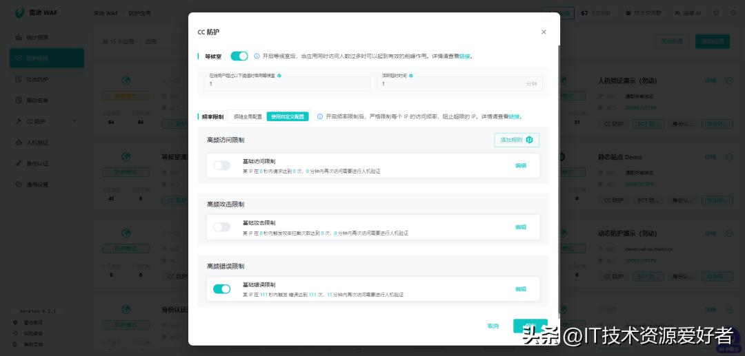 雷池 WAF 默认是不启用等候室功能的,如果需要开启等候室,只需要在界面上点击 CC 防护 按钮,然后配置等候室的相关参数即可。