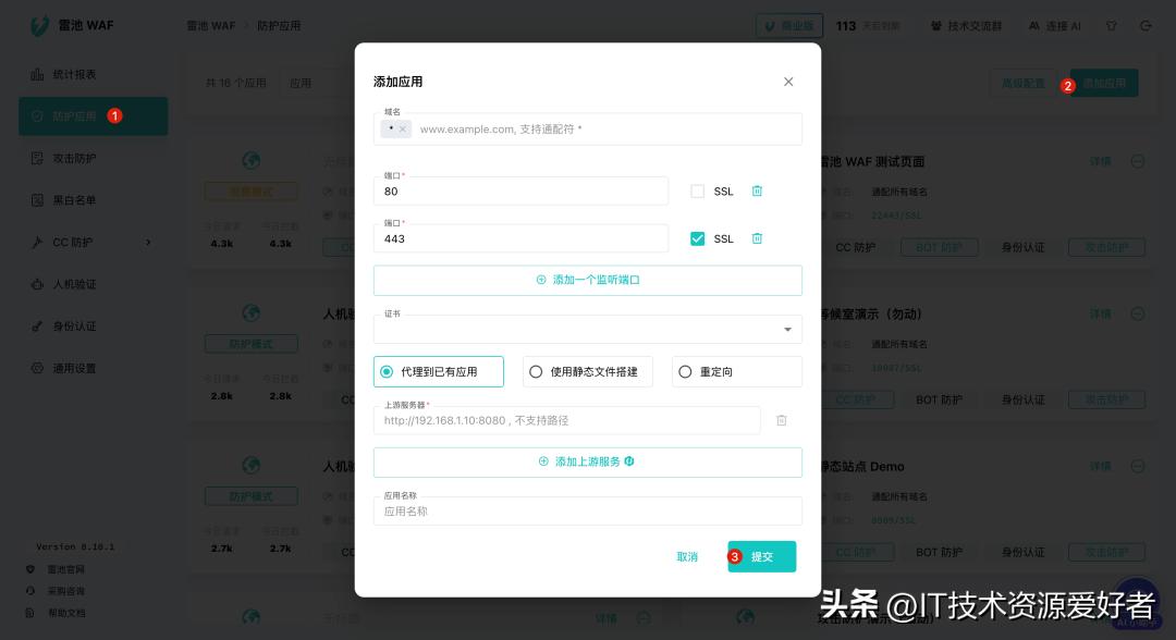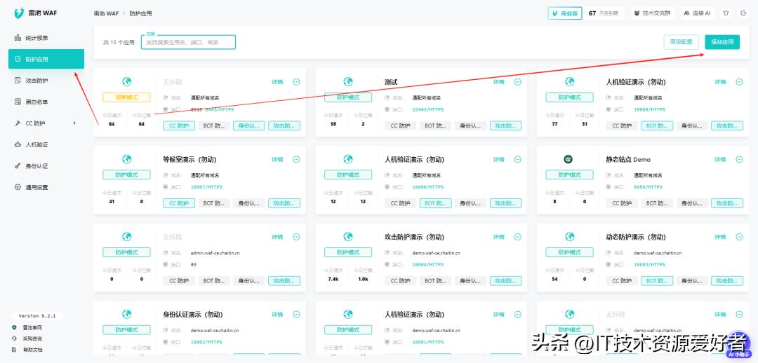 成功登录雷池控制台管理页面然后进入防护应用页面, 点击右上角的添加应用按钮进行配置:
