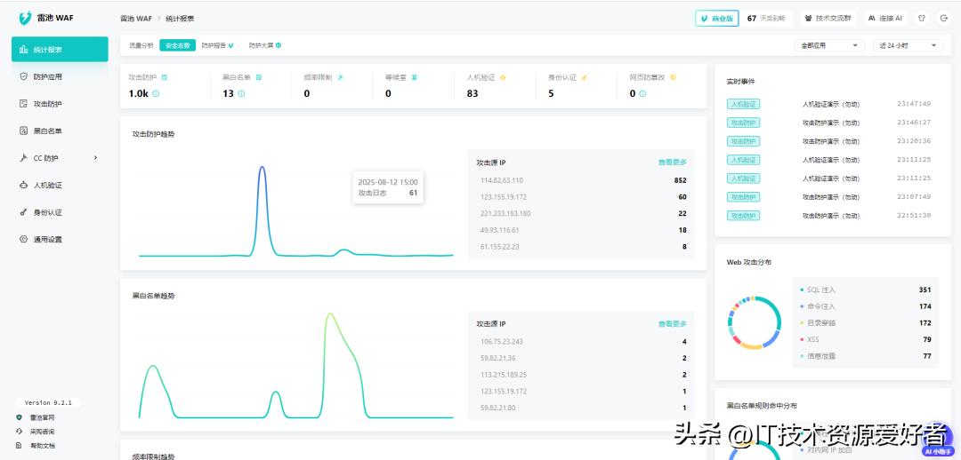 安全态势统计报表如下所示,统计数据包括攻击防护、黑白名单、频率限制、人机验证、网页防篡改等等: